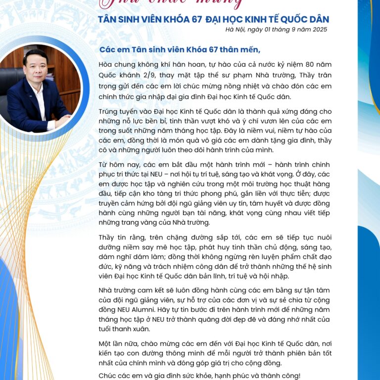 Đại học Kinh tế Quốc dân chúc mừng và chào đón các thí sinh chính thức trở thành Tân sinh viên khóa 67 của Đại học. 1. Thông Báo số 1886 ngày 22.8.2025 V.v Thông Báo điểm chuẩn trúng tuyển đại học chính quy năm 2025 của Đại học KTQD.pdf 2. Hướng dẫn nhập học: Hướng-dẫn-XNNH-Nhaphoc-dành-cho-tân-sinh viên-khóa…