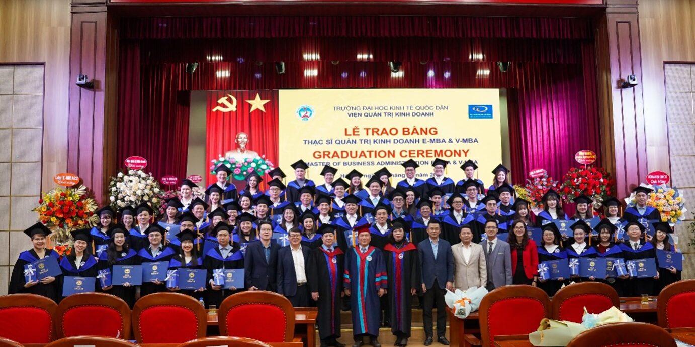 Chiều ngày 09/03/2024, tại Nhà Văn hóa – Hội trường A, Viện Quản trị Kinh doanh, Trường Đại học Kinh tế Quốc dân đã long trọng tổ chức Lễ trao bằng tốt nghiệp cho 61 tân thạc sĩ chương trình Thạc sĩ Quản trị Kinh doanh đào tạo bằng tiếng Anh E-MBA và đào tạo bằng tiếng Việt V-MBA.