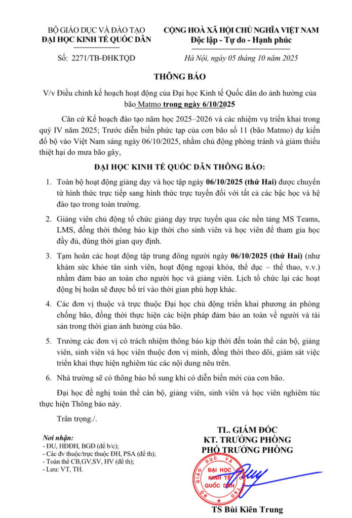 Căn cứ Kế hoạch đào tạo năm học 2025-2026 và các nhiệm vụ triển khai trong quý IV năm 2025; Trước diễn biến phức tạp của cơn bão số 11 (bão Matmo) dự kiến đổ bộ vào Việt Nam sáng ngày 06/10/2025, nhằm chủ động phòng tránh và giảm thiểu thiệt hại do mưa bão gây ra, Đại học Kinh tế Quốc dân thông báo: