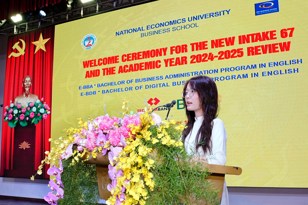 Đại diện cho các tân sinh viên phát biểu tại buổi lễ, tân sinh viên Nguyễn Bích Ngọc đã xúc động chia sẻ: “Cũng chỉ trong vòng 1 tháng được học tập, trải nghiệm môi trường đào tạo tại Viện Quản trị Kinh doanh, những lo lắng ban đầu của chúng em đã nhường chỗ cho những kỉ niệm đầu tiên vô cùng đáng nhớ: những bài giảng, bài tập nhóm đầu tiên, những buổi cuối giờ học bận rộn chuẩn bị team building, và đặc biệt nhất, một ngày team building đáng nhớ khiến chúng em không còn là những gương mặt xa lạ mà trở thành những người bạn, người đồng đội và một gia đình thật sự.
