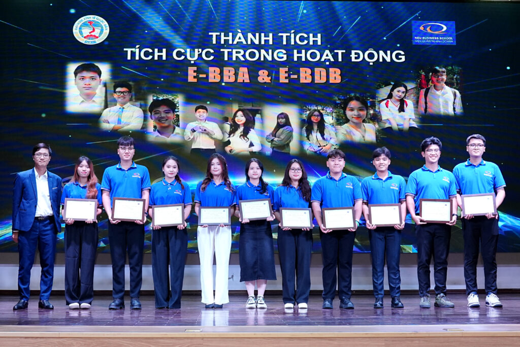 Năm học 2024-2025, các sinh viên đang theo học các chương trình E-BBA và E-BDB đã đạt nhiều thành tích ấn tượng trong học tập. Có 27 sinh viên xếp loại hoc lực xuất sắc, 394 sinh viên xếp loại học lực giỏi. Trình độ tiếng Anh của sinh viên ngày càng được nâng cao. Tỷ lệ sinh viên đạt CĐR IELTS 6.0 ngay từ khi nhập học của K67 đạt 84,9% . Bên cạnh thành tích học tập, sinh viên các chương trình E-BBA và E-BDB còn tích cực tham gia các hoạt động như tham quan các doanh nghiệp lớn như công ty TNHH Heineken; trao đổi sinh viên quốc tế với các sinh viên Nhật Bản; tham gia các cuộc thi văn nghệ, thể thao do Viện QTKD và Đại học KTQD tổ chức. Không chỉ đạt thành tích cao trong học tập, sinh viên các chương trình E-BBA và E-BDB còn tham gia đông đảo và đạt nhiều giải thưởng cao trong cuộc thi nghiên cứu khoa học sinh viên. Năm 2025, có 22 nhóm sinh viên đạt giải NCKH cấp Đại học trong đó có 2 nhóm đạt giải Nhất, 2 nhóm đạt giả nhì và 6 nhóm đạt giải Ba và 12 nhóm đạt giải Khuyến khích. Các sinh viên/ nhóm sinh viên có thành tích xuất sắc trong học tập và NCKH và các sinh viên hoạt động tích cực đã nhận được những xuất học bổng có giá trị từ các cá nhân, tổ chức và từ Viện QTKD.