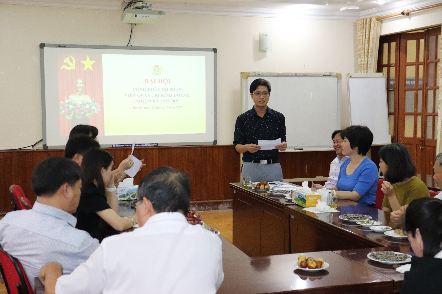 Thay mặt Ban Chấp hành Công đoàn Bộ phận Viện Quản trị Kinh doanh nhiệm kỳ 2023 – 2025, TS. Lê Văn Nam – Chủ tịch Công đoàn Viện đã trình bày báo cáo tổng kết hoạt động công đoàn giai đoạn 2023 – 2025, nêu bật những kết quả nổi bật, những kinh nghiệm quý báu đạt được trong công tác chăm lo đời sống, bảo vệ quyền và lợi ích của cán bộ, giảng viên, người lao động. Đồng thời, đồng chí cũng trình bày phương hướng, nhiệm vụ trọng tâm của Công đoàn Viện QTKD trong nhiệm kỳ 2025 – 2030, với mục tiêu tiếp tục phát huy tinh thần đoàn kết, đổi mới và sáng tạo, góp phần xây dựng tổ chức công đoàn vững mạnh, đồng hành cùng sự phát triển bền vững của Viện Quản trị Kinh doanh và Đại học Kinh tế Quốc dân.