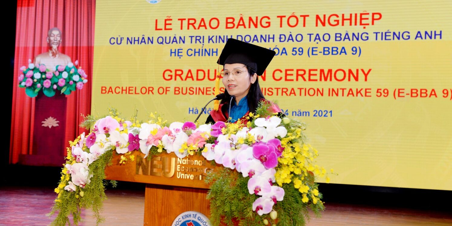 Phát biểu tại buổi lễ, GS.TS Trần Thị Vân Hoa nhiệt liệt chúc mừng và biểu dương thành tích của các tân cử nhân, và hy vọng rằng những kiến thức, kỹ năng và lợi thế về ngôn ngữ mà các em đã được trang bị sẽ là hành trang quan trọng giúp các em có những khởi đầu tốt đẹp trên con đường phát triển nghề nghiệp và có những đóng góp cho xã hội để tiếp tục làm rạng rỡ danh tiếng của trường Đại học Kinh tế Quốc dân và của Viện Quản trị Kinh doanh. GS. Phó hiệu trưởng nhắn nhủ các tân cử nhân: “Từ hôm nay, các em sẽ được tham gia mạng lưới cựu sinh viên của Viện Quản trị Kinh doanh và của Trường Đại học Kinh tế Quốc dân. Các em hãy nghĩ xem cựu sinh viên khác gì với sinh viên, và chúng ta phải có trách nhiệm như thế nào để xứng đáng với tấm bằng nhân được ngày hôm nay. Cô mong rằng khi ra trường các em sẽ tiếp tục thành công hơn nữa, viết tiếp những trang sử hào hùng của cựu sinh viên Đại học Kinh tế Quốc dân và cựu sinh viên Viện Quản trị Kinh doanh”. GS. Phó hiệu trưởng mong muốn các tân cử nhân hãy thường xuyên giữ liên lạc với Trường thông qua mạng lưới cựu sinh viên, là cầu nối để gắn kết hoạt động đào tạo và nghiên cứu của nhà trường với cộng đồng doanh nghiệp, với các hoạt động kinh tế xã hội của đất nước.