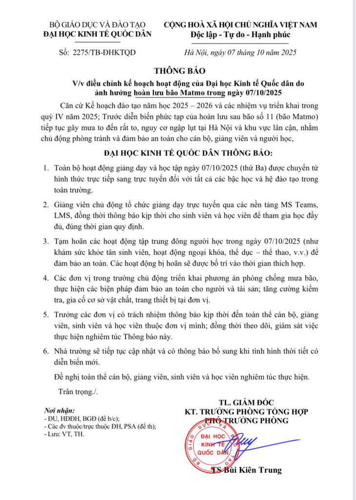 Căn cứ Kế hoạch đào tạo năm học 2025-2026 và các nhiệm vụ triển khai trong quý IV năm 2025; Trước diễn biến phức tạp của hoàn lưu sau bão số 11 (bão Matmo) tiếp tục gây mưa to đến rất to, nguy cơ ngập lụt tại Hà Nội và khu vực lân cận, nhằm chủ động phòng tránh và đảm bảo an toàn cho cán bộ, giảng viên và người học, Đại học Kinh tế Quốc dân thông báo: