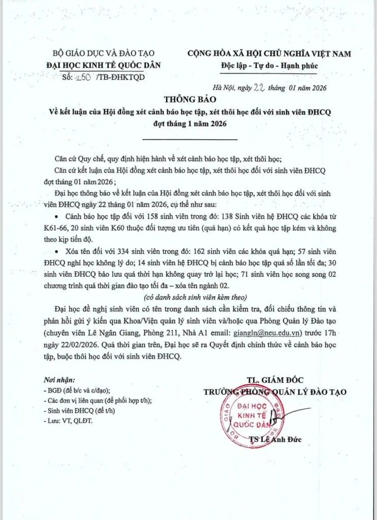 Thông báo về kết luận của Hội đồng xét cảnh cáo học tập, xét thôi học đối với sinh viên ĐHCQ đợt tháng 1 năm 2026